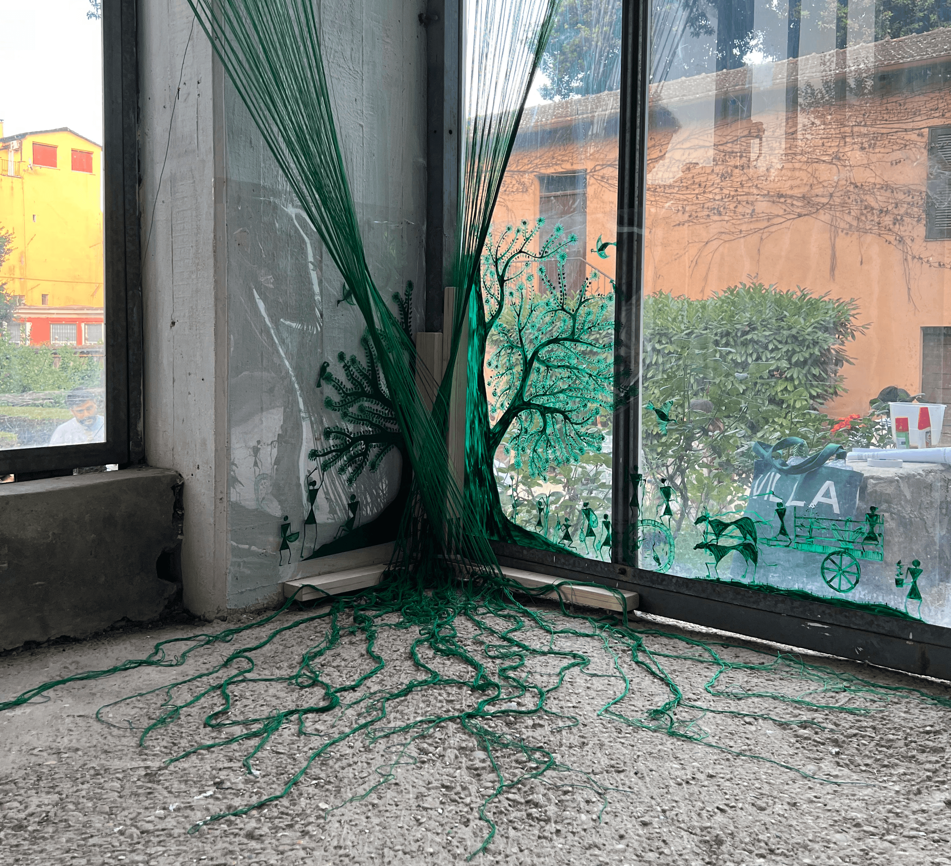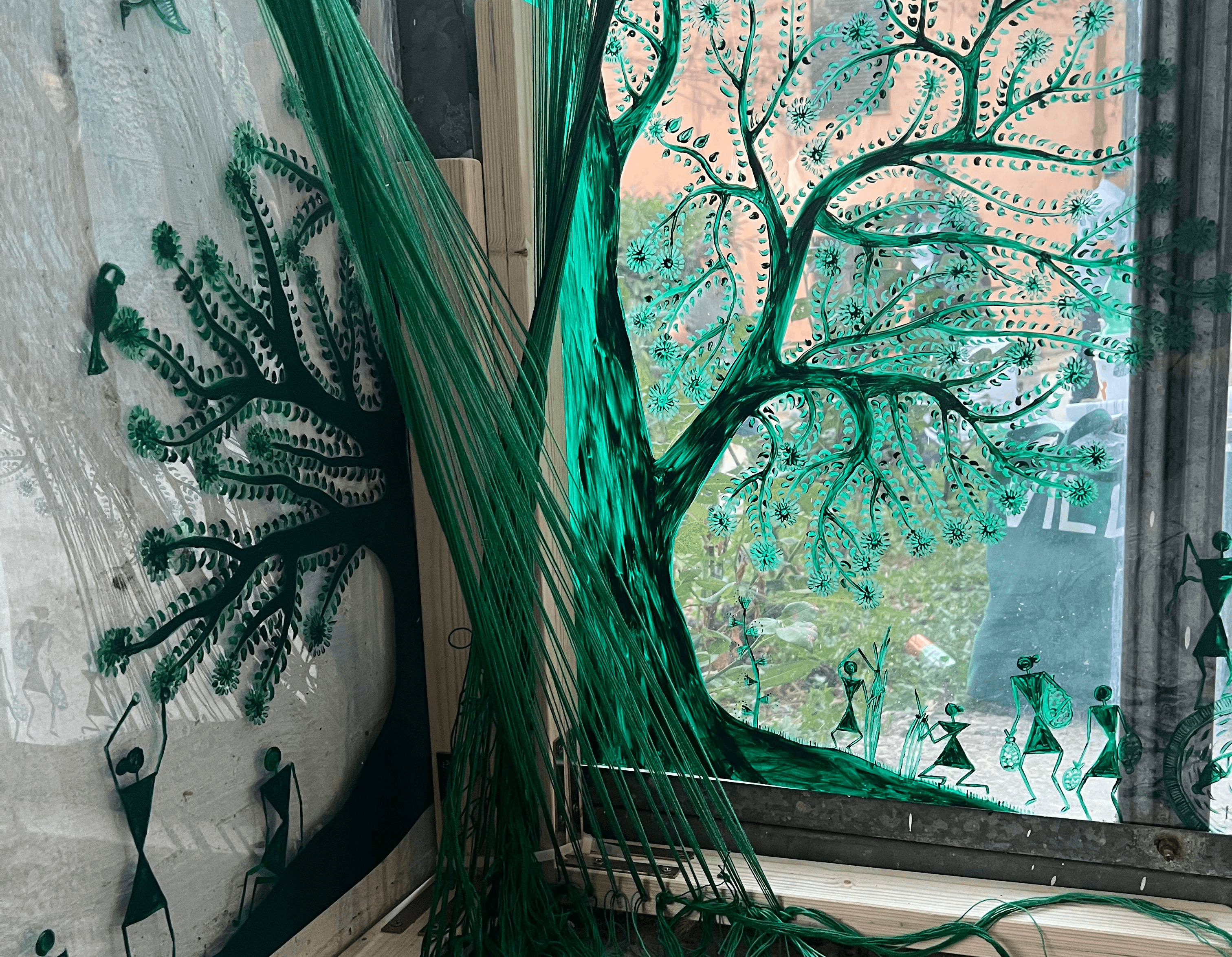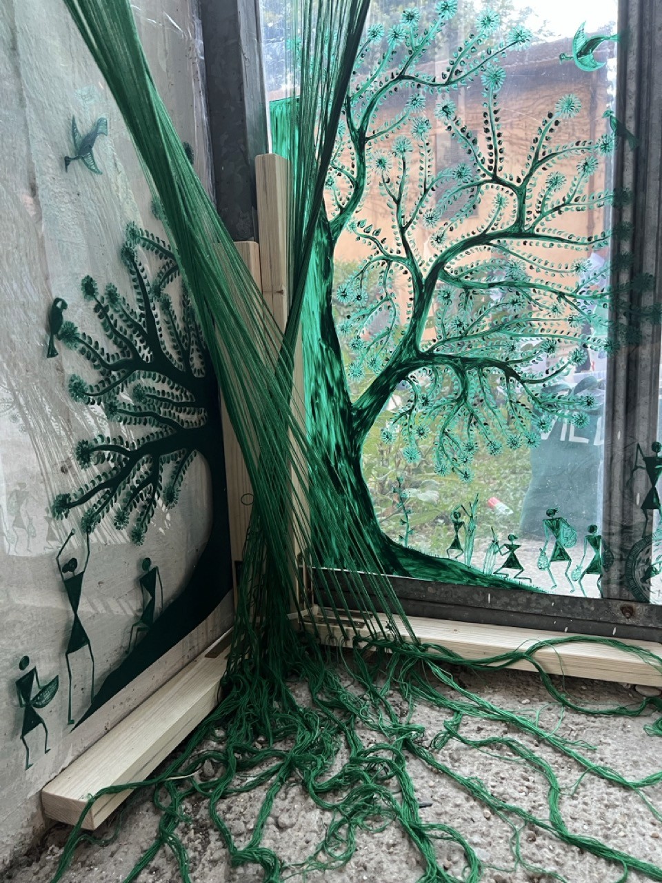 The artist uses nature centric folk art called ‘Warli Painting’ and creates a contemporary take on it to question the current destructive relationship between Nature and human as opposed to the historic beneficial relationship between the two.