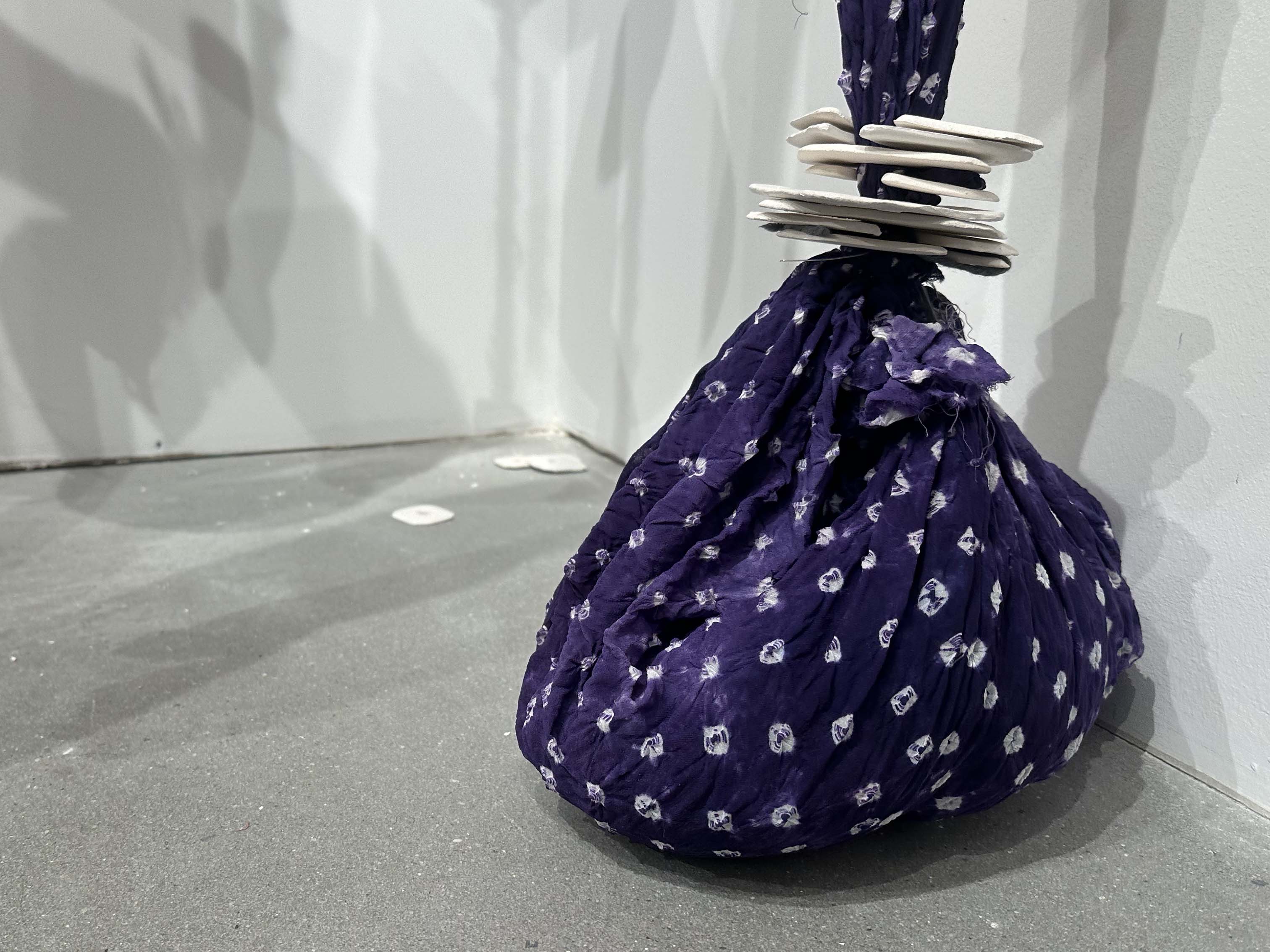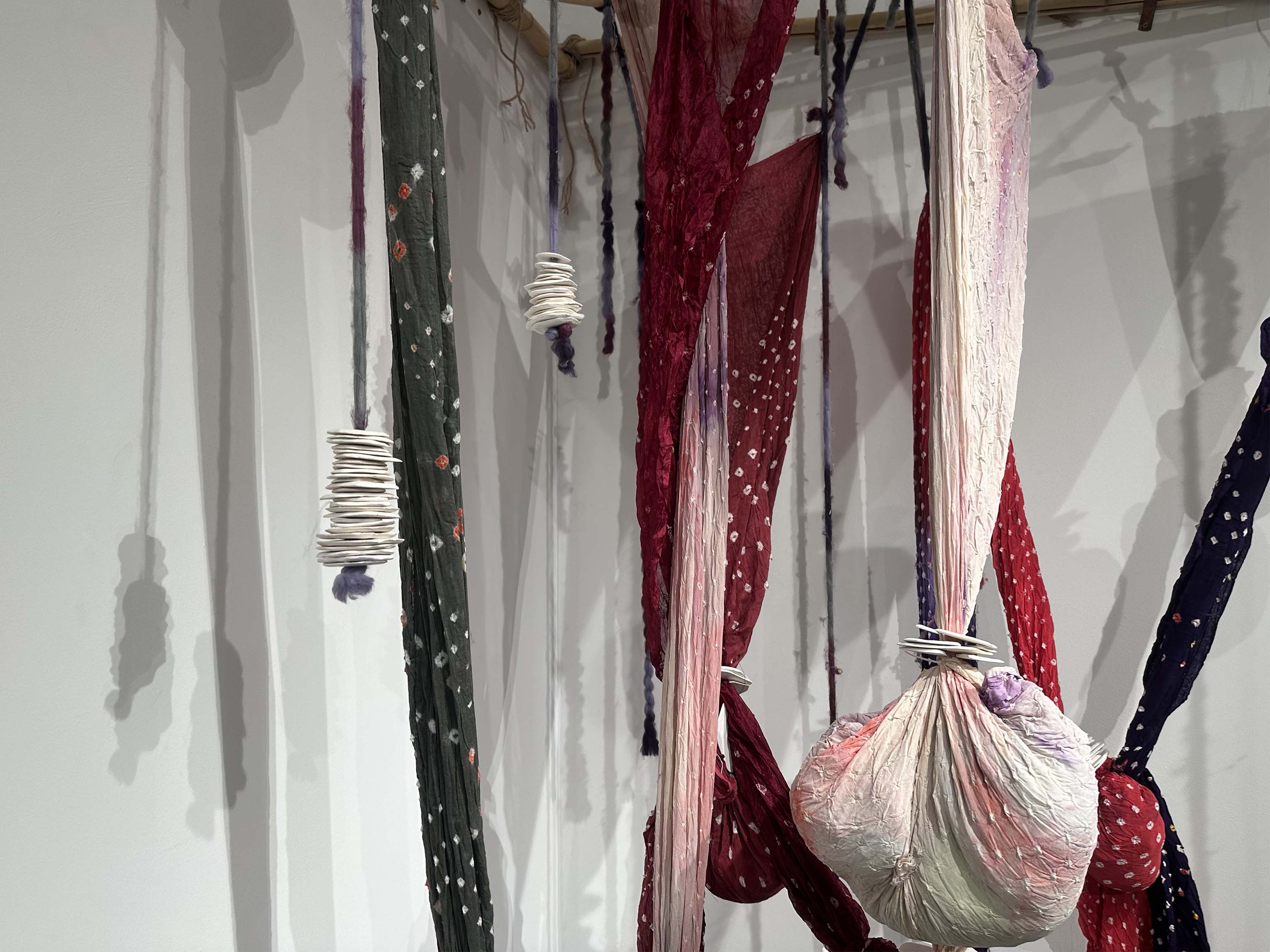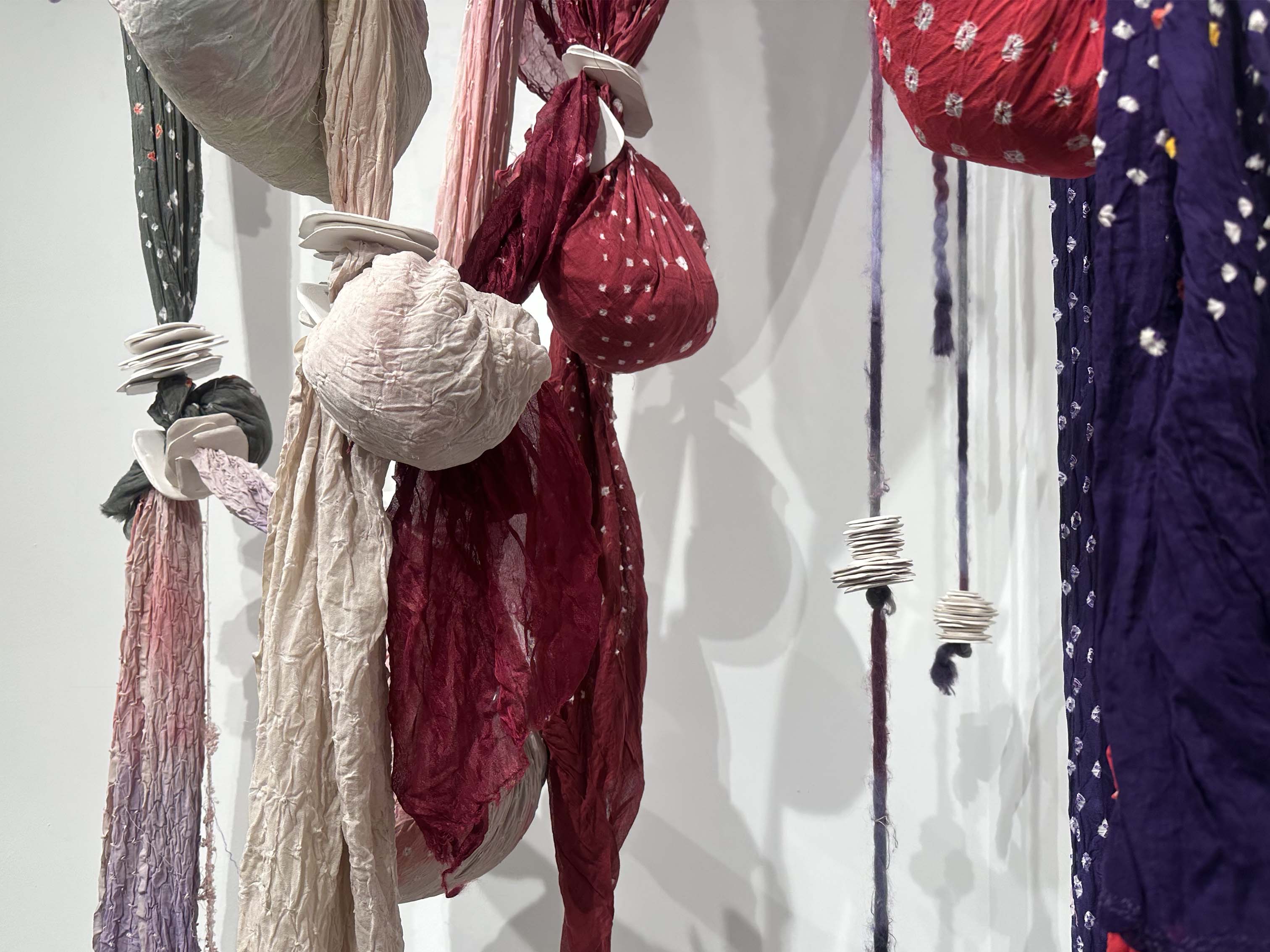 Bandhani fabric, bamboo, ceramic tiles, rope